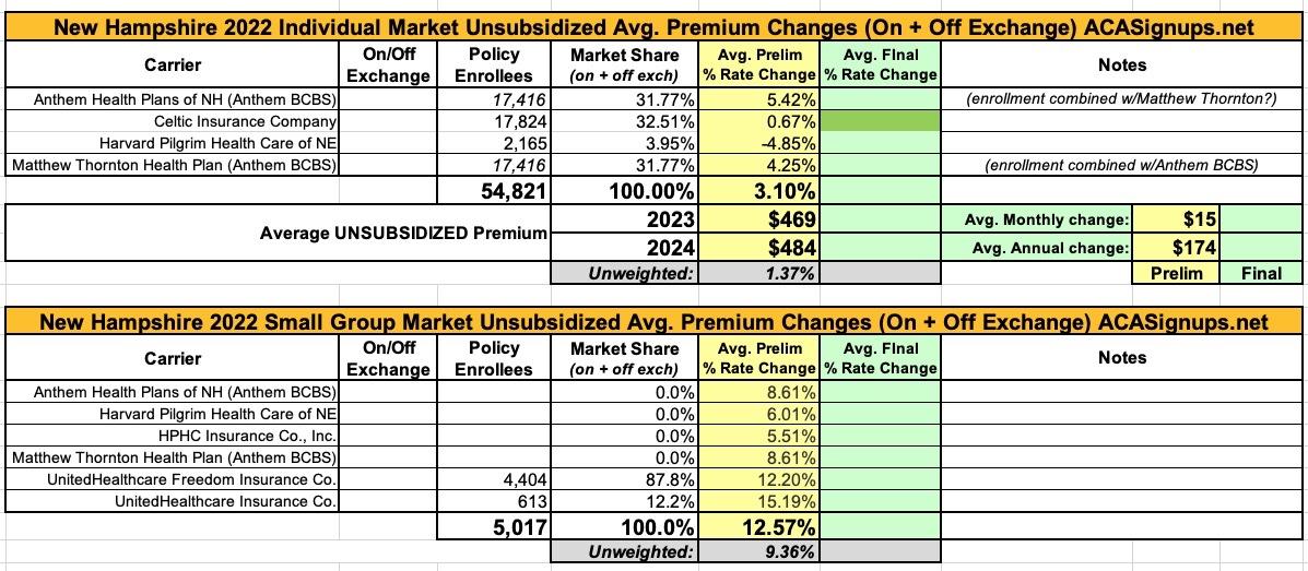 New Hampshire: Preliminary avg. unsubsidized 2024 #ACA rate changes: 3.1%