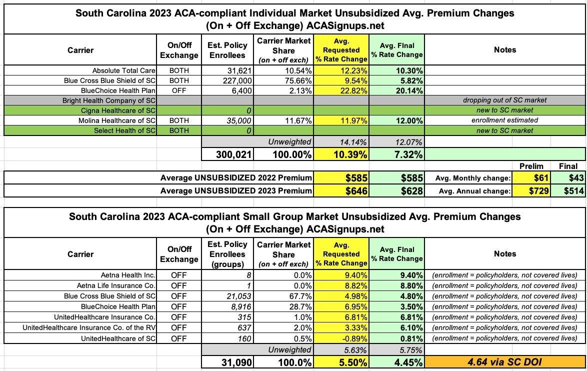 South Carolina: Final avg. unsubsidized 2023 #ACA rate changes: +7.3% (down from 10.4%)