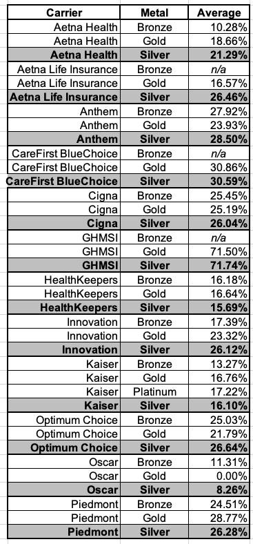 Consider this: The tables below show the preliminary rate increases for every VA ACA plan being renewed next year assuming the reinsurance program isn't kept in place. The last table shows a summary of the average increases of the Bronze, Silver and Gold plans for each carrier: