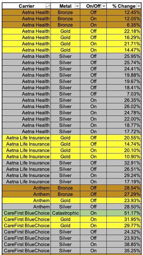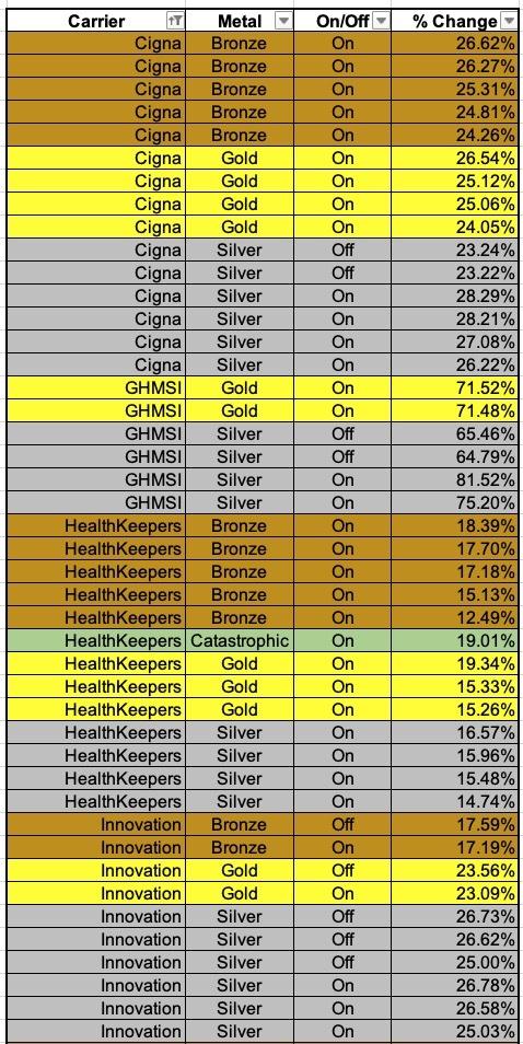 Overall, it looks like Bronze plans are going up perhaps 19.0%, Silver plans by 27.0% and Gold plans by around 24.5%.