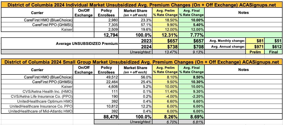 District of Columbia: *Final* Avg. Unsubsidized 2024 #ACA Rate Change: +7.8% (down from +12.3%)