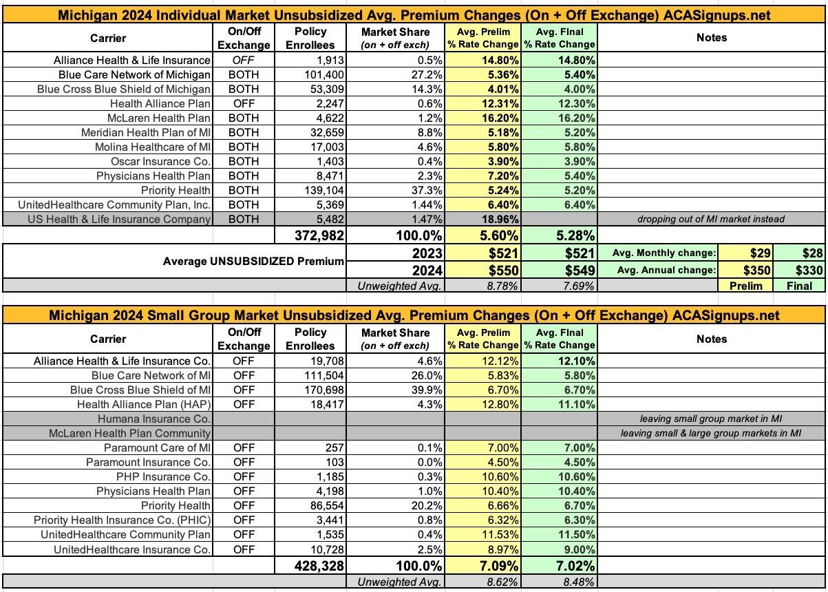 Michigan: *Final* Avg. Unsubsidized 2024 #ACA Rate Change: +5.3%...w/one carrier bailing for an interesting reason...