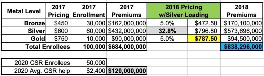 This carrier had 100,000 enrollees in 2017 and had to pay out $120 million in CSR assistance. They assumed that total enrollment and their CSR costs would be around the same (and the same ratios) in 2018 Since they knew they wouldn't get reimbursed from the federal government for their CSR costs in 2018, simply raising their premiums by 5% would mean a $120 million loss. Ouch: