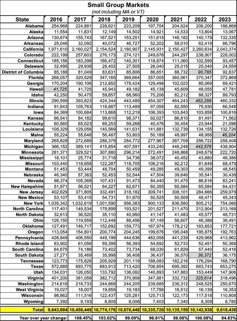 I can't include Massachusetts or Vermont as both states have merged their individual & small group markets together for risk adjustment purposes, and there were a handful of states missing in a couple of years (2022 in particular has 5 states missing, not sure why). Otherwise, however, the U.S. small group market has ranged within a pretty narrow range of 9.6 - 10.8 million over the years. In fact, as of 2023 it was right back where it was in 2016, at a bit over 9.6 million.