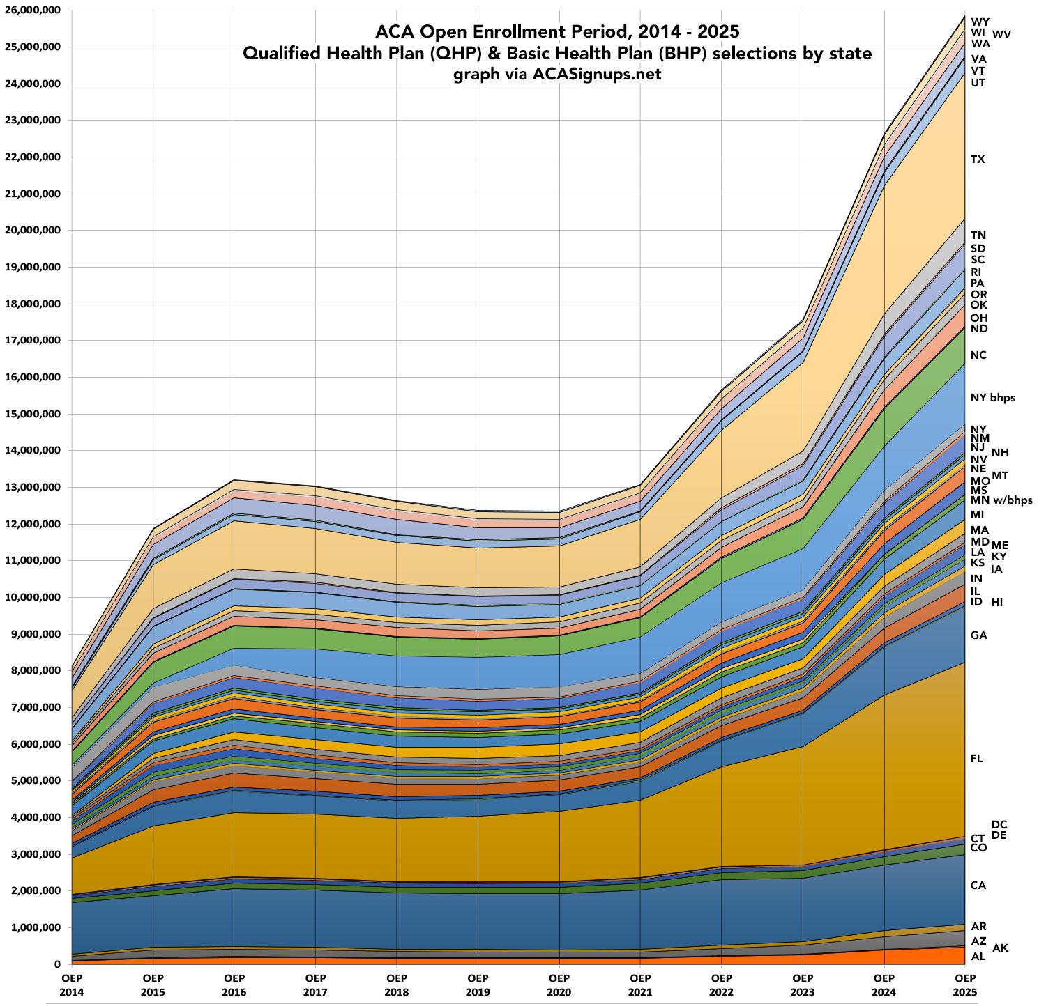 There's still likely up to perhaps ~30,000 or so Qualified Health Plan (QHP) enrollments to be added to the 2025 Open Enrollment Period (OEP) tally from the states which haven't reported their final, data (in fact, CA, DC, NJ, NY & RI haven't ended theirs yet), but I decided to throw this together today for the hell of it.