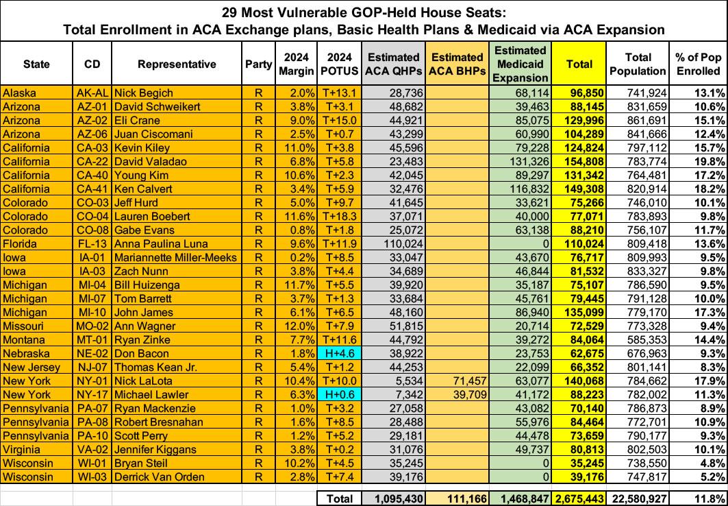 Across these 29 districts alone, a total of nearly 2.7 million Americans are at risk of either losing healthcare coverage entirely or, if they don't, having to deal with MASSIVE premium hikes and/or a MOUNTAIN of paperwork on a regular basis to keep it due to a combination of H.R. 1 (the "One Big Beautiful Bill Act") being implemented, the GOP allowing the IRA subsidies to expire at the end of this year, and the Trump Administration implementing CMS's recent "Integrity Rule" starting this fall.