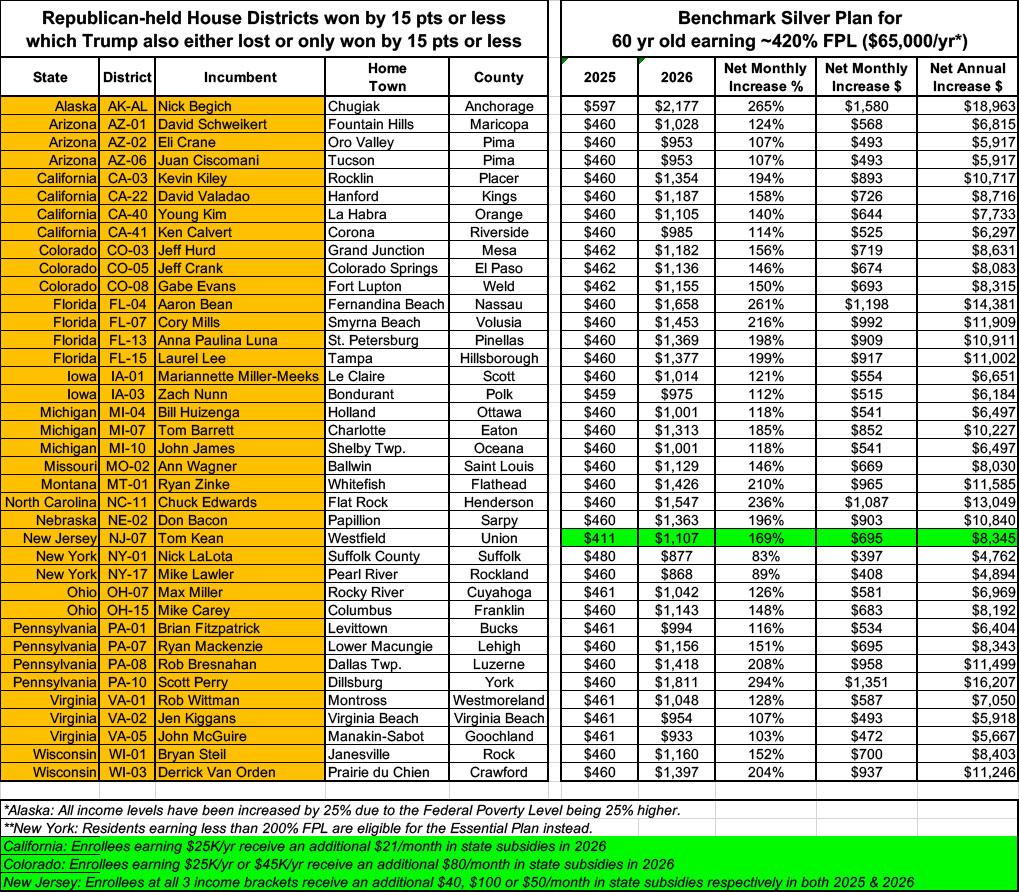 In NY-01 (Nick LaLota), a 60-yr old enrollee will go from paying just $480 to $877/month...an 83% rate hike. And that's the least-dramatic example.