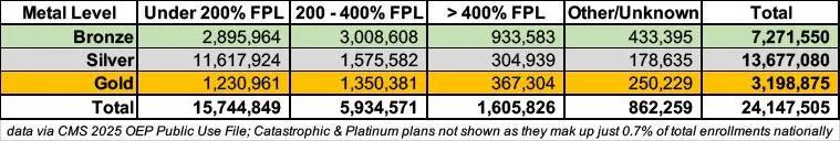 Here’s a breakout of 2025 ACA exchange enrollment by metal level and income bracket: