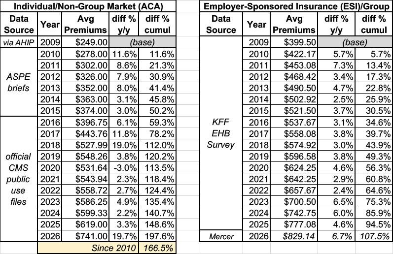 IMPORTANT:  Yes, average individual market premiums cost around 38% less than average ESI premiums before the ACA was passed back in 2009, and yes, the ACA did indeed cause gross premiums to increase significantly starting a few years later...but there's an important reason for that: PRIOR TO 2014, INDIVIDUAL MARKET PLANS DIDN'T HAVE TO PROVIDE COVERAGE TO ENROLLEES WITH PRE-EXISTING CONDITIONS, and also didn't include a long list of other things which all ACA plans are required to include (community rating, a ceiling on out of pocket costs, NO annual or lifetime coverage limits, having to include free preventative care services, having to cover 10 Essential Health Benefits, etc etc.