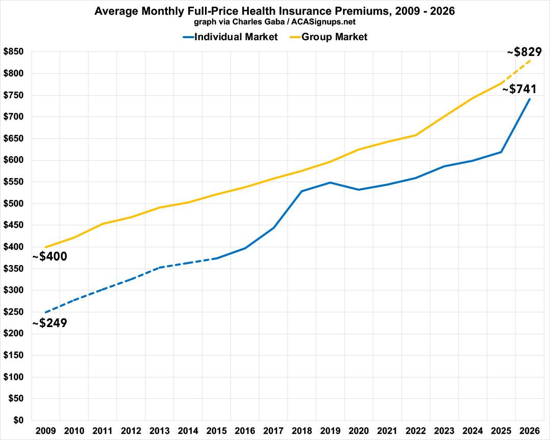 • 2026 ACA plans premiums are ~$741/mo on average, or ~$8,892/yr. Via the ACA's Medical Loss Ratio (MLR) rule, around 20% of that should be the carrier's gross margin, leaving around ~$7,114, which, in theory, should cover around 76.1% of actual medical expenses (in aggregate). This would theoretically put average total medical expenses at around $9,347 per enrollee this year...which means, on average, ACA enrollees should have to spend around $2,233 in out of pocket costs.
