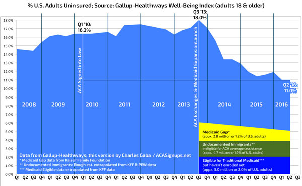By cutting off the first 10 percentage points, this makes the uninsured rate drop since the ACA was implemented seem far more impressive than it already is. I support the ACA, but still prefer the situation be presented as accurately as possible. As a result, I keep reformatting Gallup's data like so (I also add some additional data points for further context):
