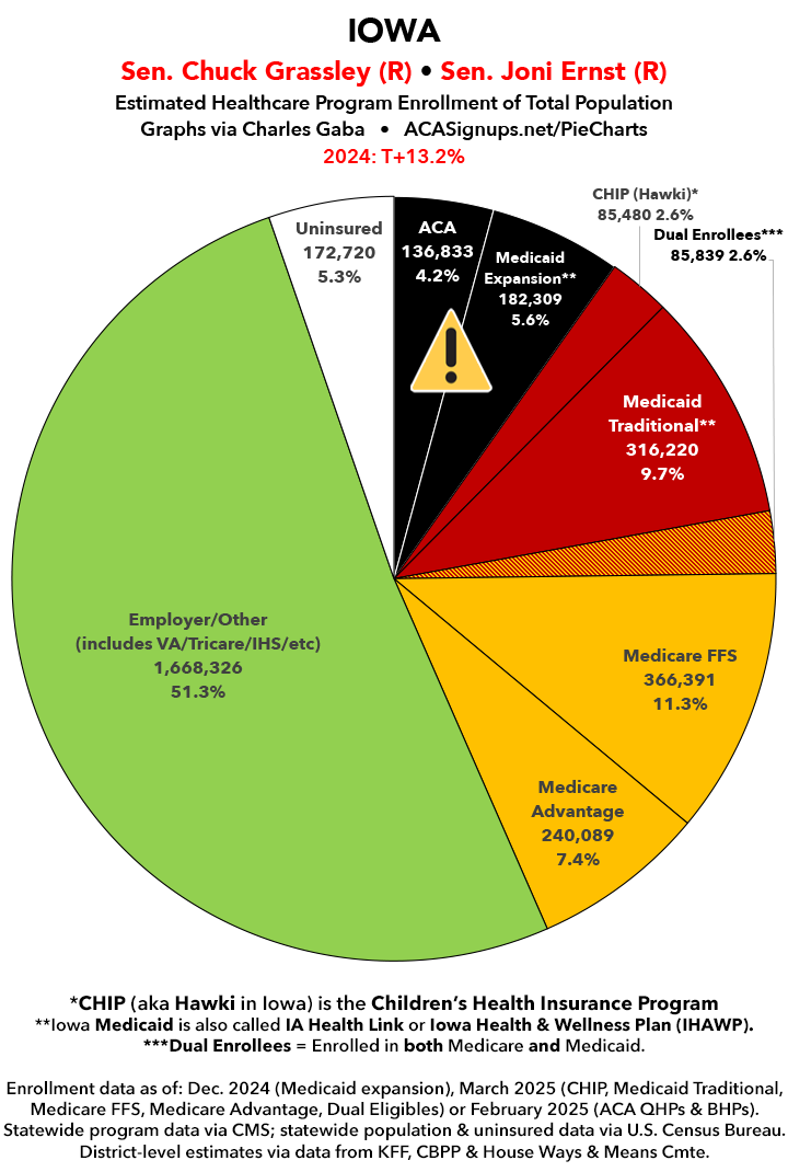 UPDATE 7/4/25: I've updated the web versions of the graphics with the most up-to-date enrollment data I have access to. The black sections w/the ⚠️ symbol are those most at risk of losing healthcare coverage due to H.R. 1, the "One Big Beautiful Bill Act" (aka the #MAGAMurderBill).