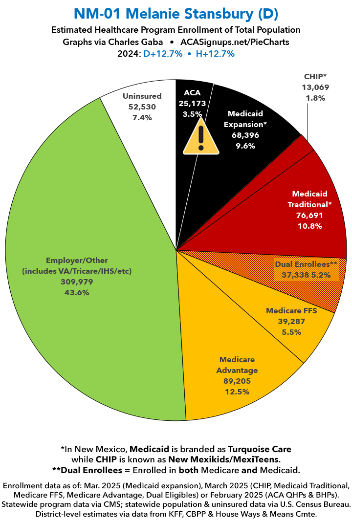 UPDATE 7/16/25: I've updated the web versions of the graphics with the most up-to-date enrollment data I have access to. The black sections w/the ⚠️ symbol are those most at risk of losing healthcare coverage due to H.R. 1, the "One Big Beautiful Bill Act" (aka the #MAGAMurderBill).