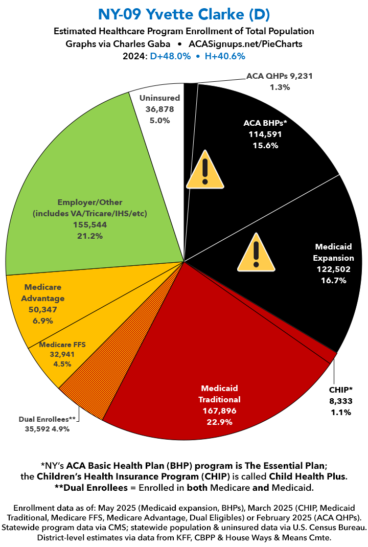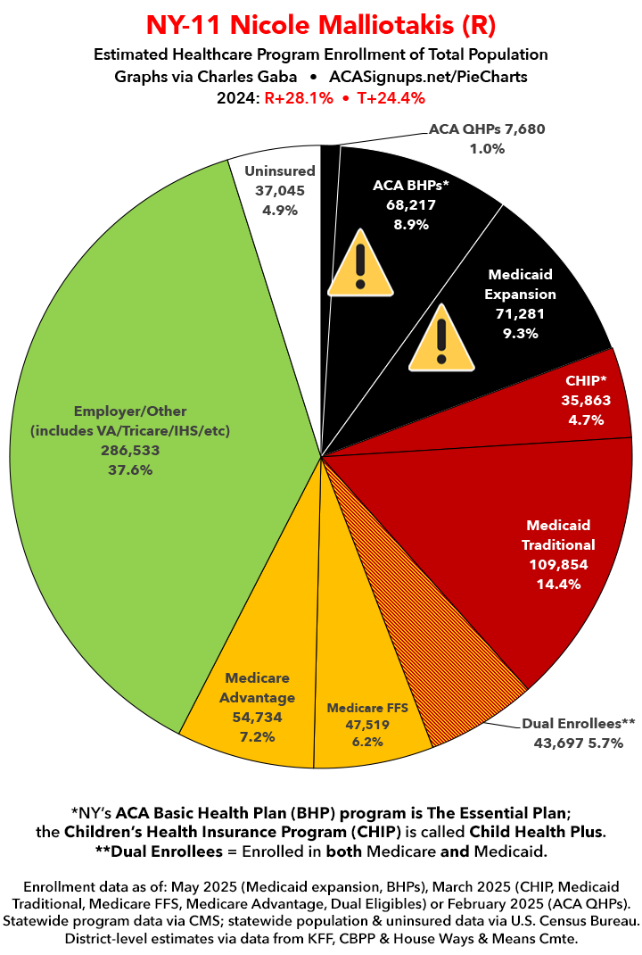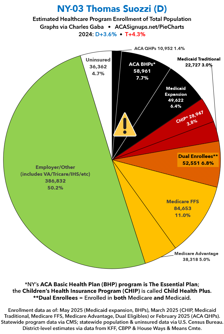 UPDATE 7/8/25: I've updated the web versions of the graphics with the most up-to-date enrollment data I have access to. The black sections w/the ⚠️ symbol are those most at risk of losing healthcare coverage due to H.R. 1, the "One Big Beautiful Bill Act" (aka the #MAGAMurderBill).