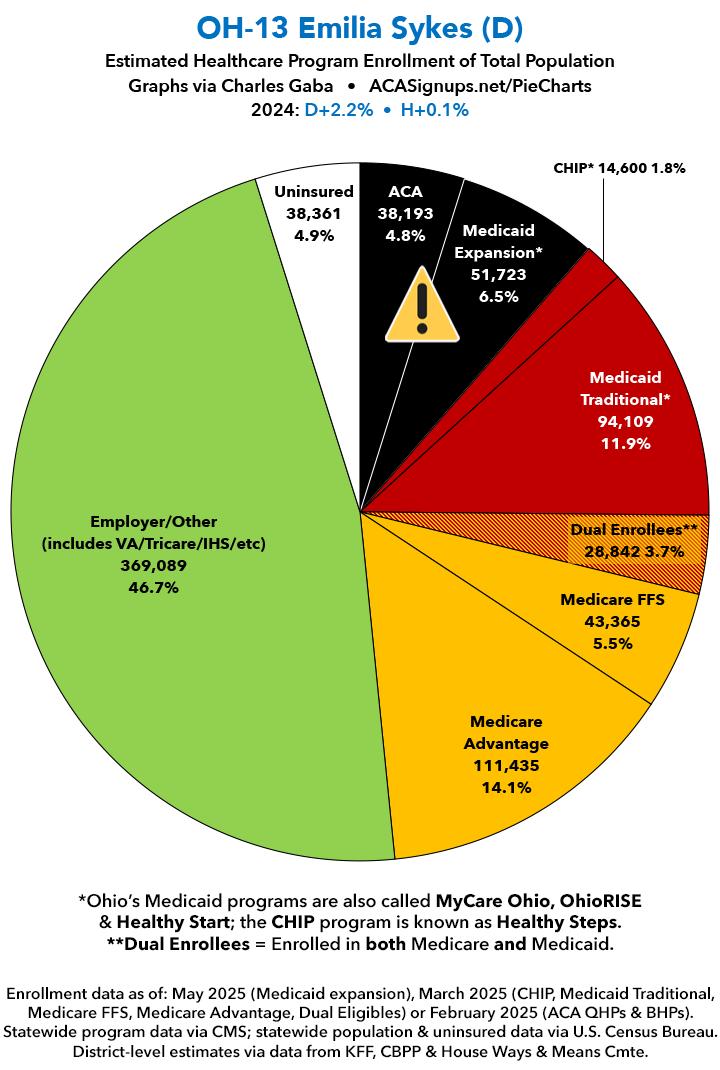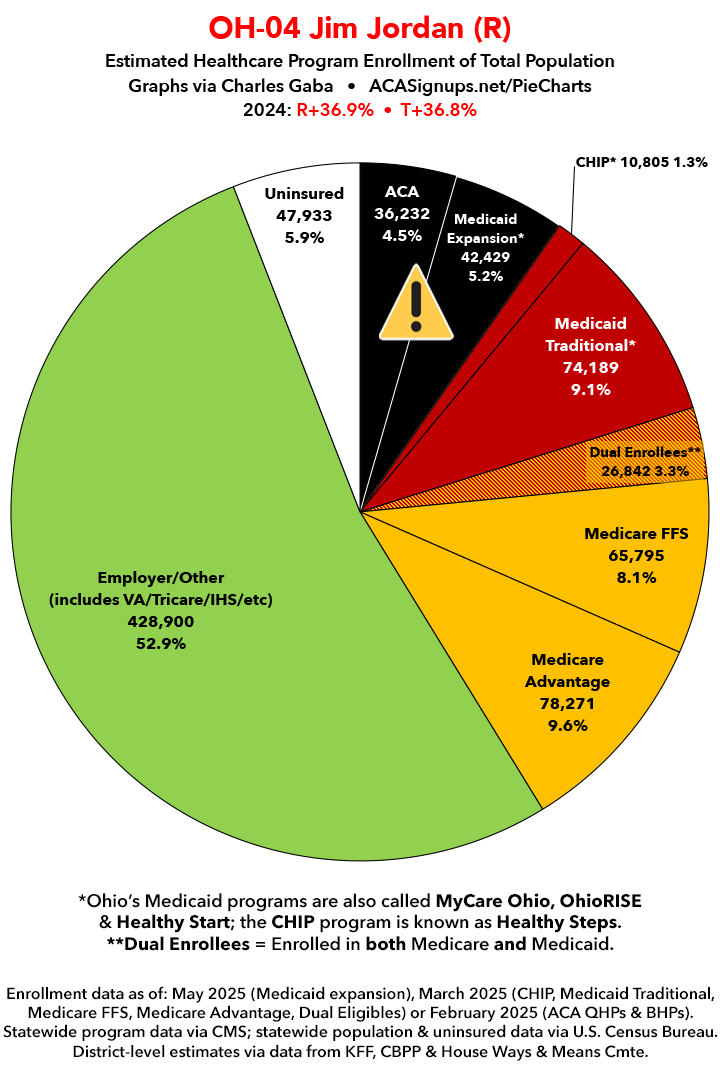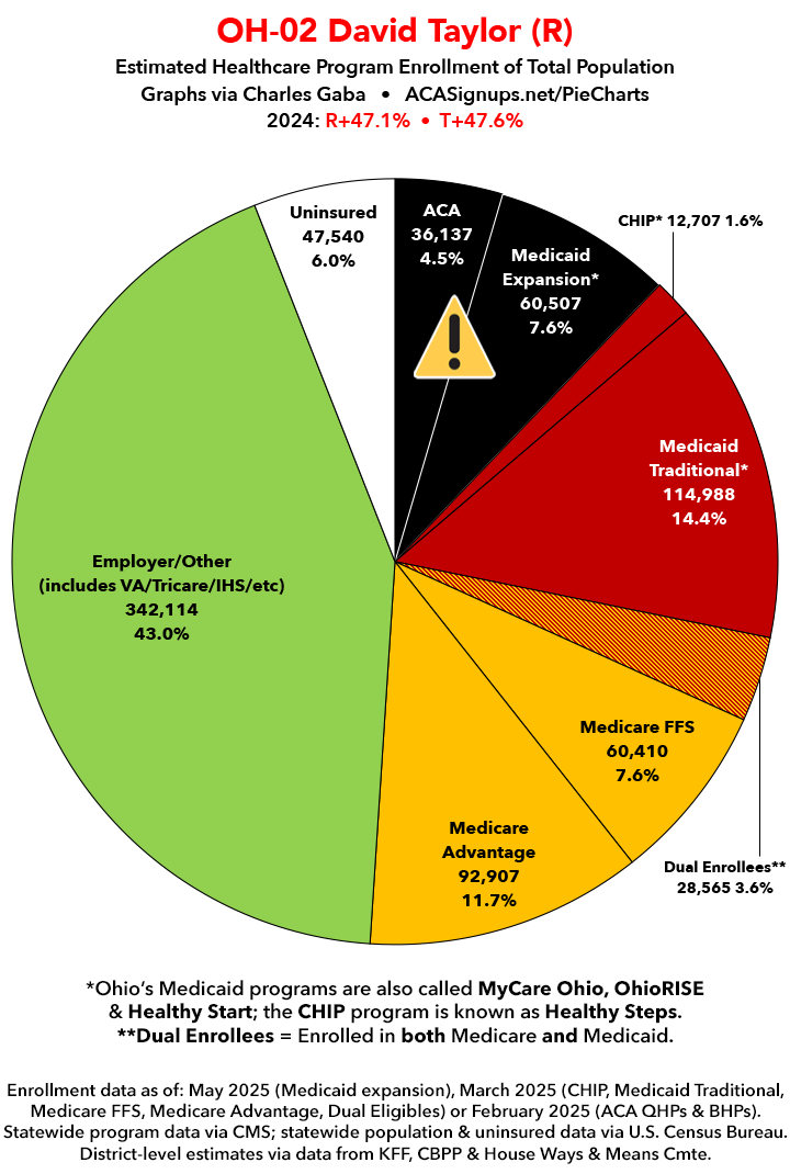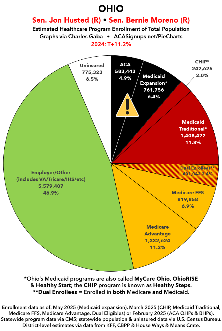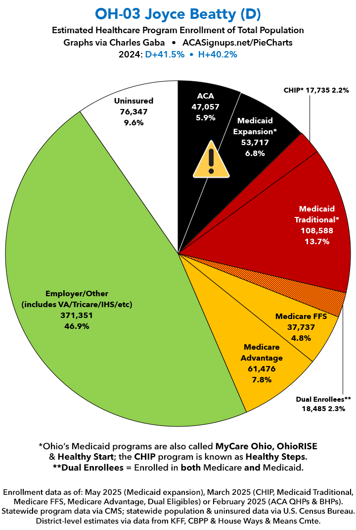 UPDATE 7/10/25: I've updated the web versions of the graphics with the most up-to-date enrollment data I have access to. The black sections w/the ⚠️ symbol are those most at risk of losing healthcare coverage due to H.R. 1, the "One Big Beautiful Bill Act" (aka the #MAGAMurderBill).