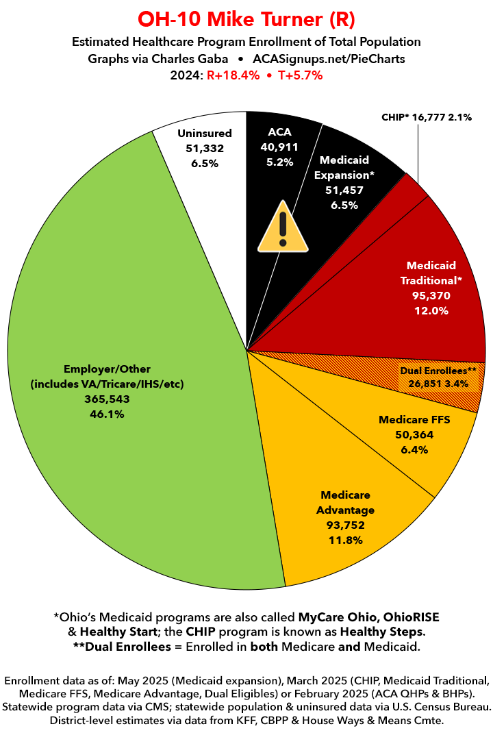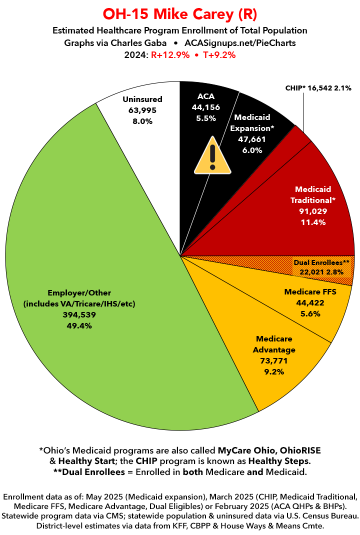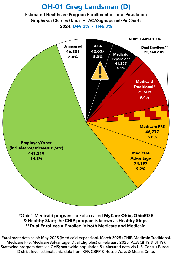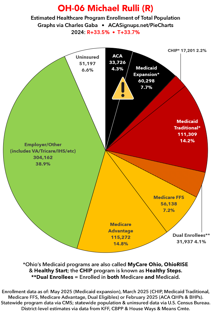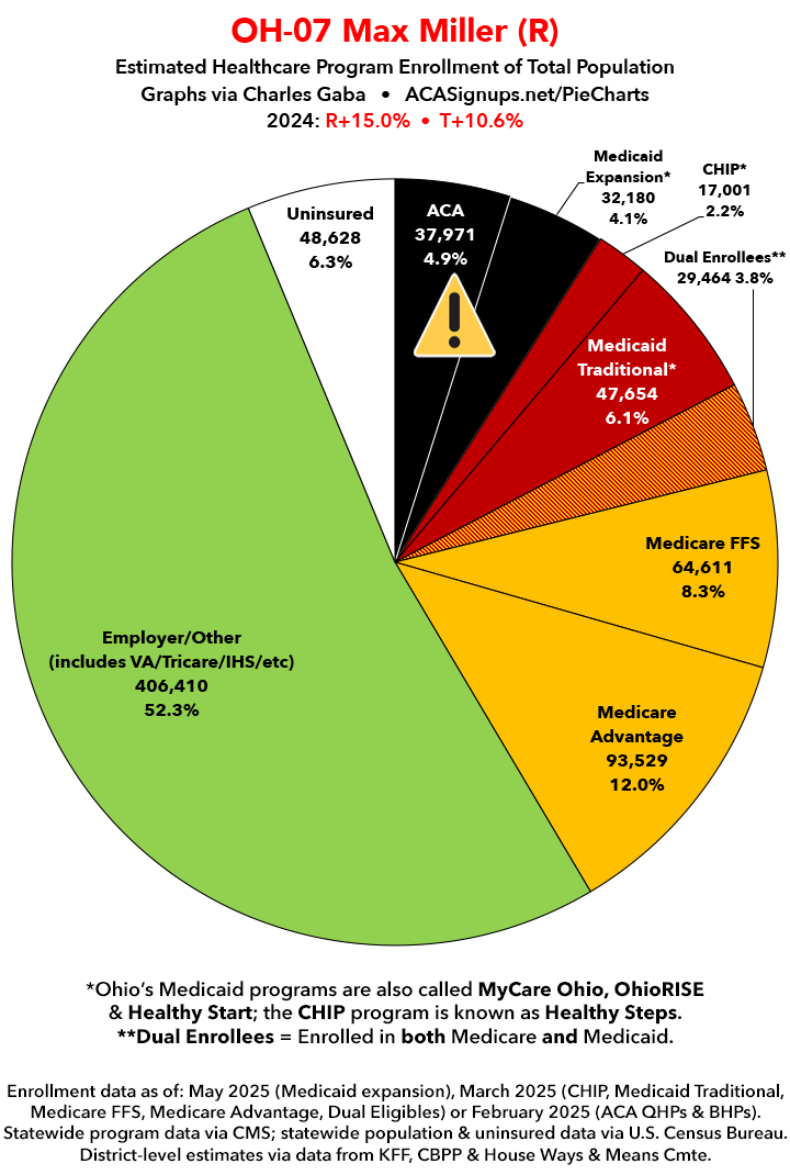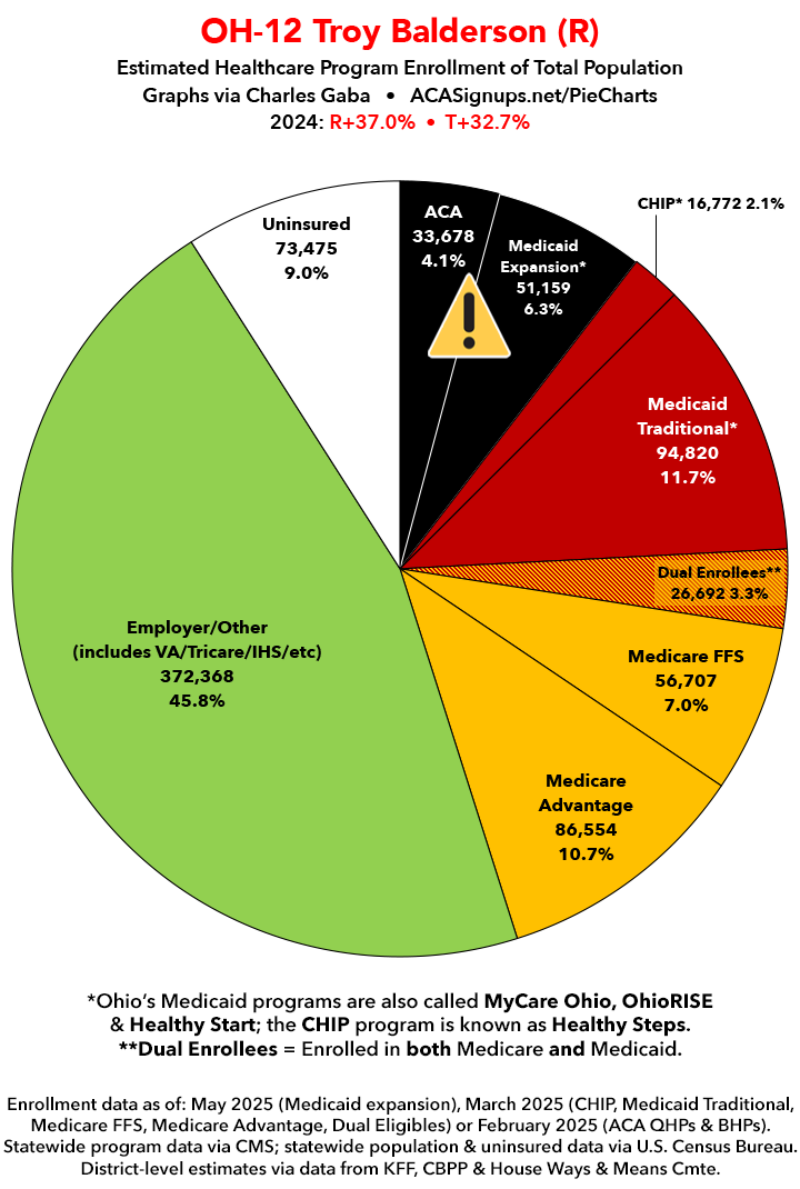 UPDATE 7/10/25: I've updated the web versions of the graphics with the most up-to-date enrollment data I have access to. The black sections w/the ⚠️ symbol are those most at risk of losing healthcare coverage due to H.R. 1, the "One Big Beautiful Bill Act" (aka the #MAGAMurderBill).
