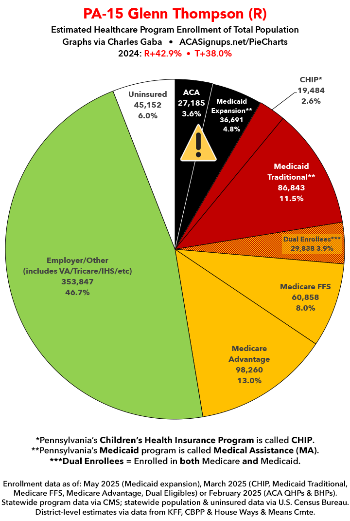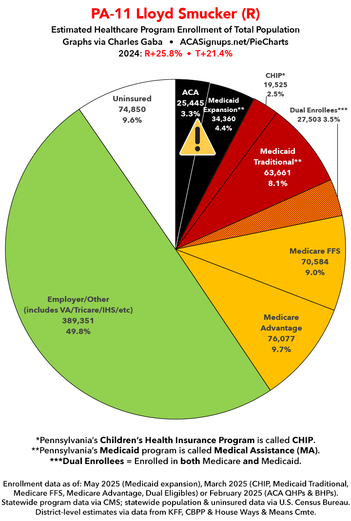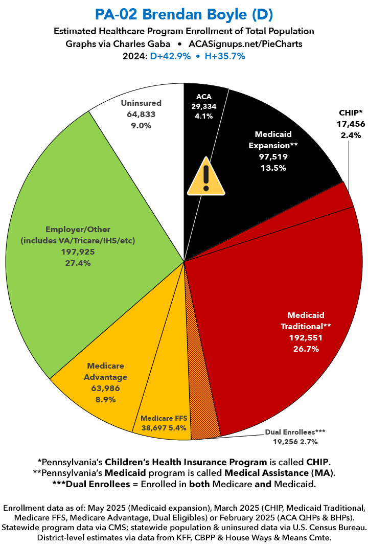 UPDATE 7/11/25: I've updated the web versions of the graphics with the most up-to-date enrollment data I have access to. The black sections w/the ⚠️ symbol are those most at risk of losing healthcare coverage due to H.R. 1, the "One Big Beautiful Bill Act" (aka the #MAGAMurderBill).