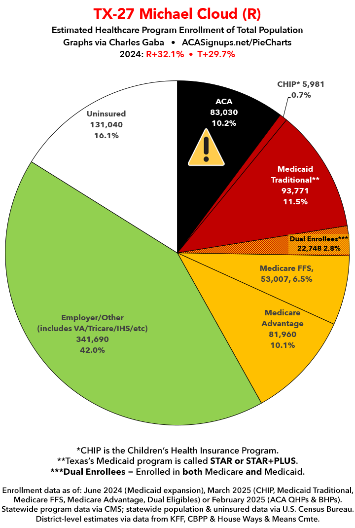 UPDATE 7/14/25: I've updated the web versions of the graphics with the most up-to-date enrollment data I have access to. The black sections w/the ⚠️ symbol are those most at risk of losing healthcare coverage due to H.R. 1, the "One Big Beautiful Bill Act" (aka the #MAGAMurderBill).