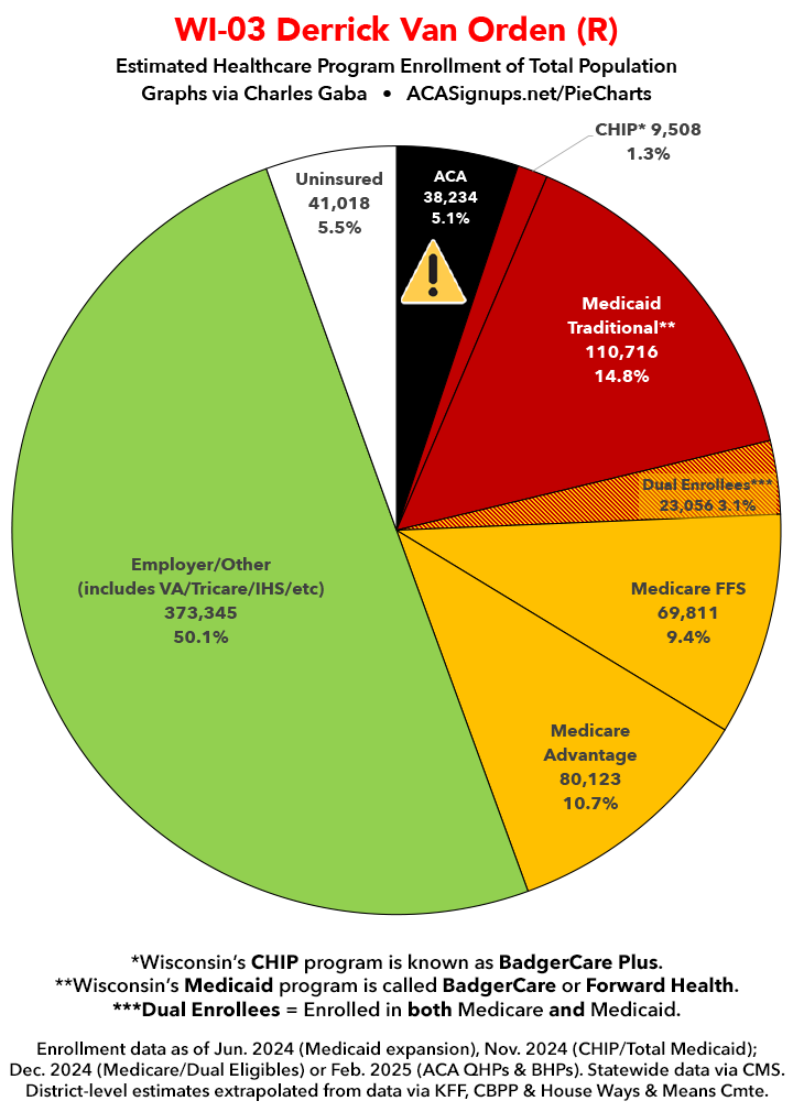 Below I've posted district-wide healthcare coverage enrollment estimates for all 29 of these House districts for reference. On average, at least 11.7% of their total populations (1 out of every ~8.5 residents) is at risk of losing healthcare coverage assuming a) the #MedicaidMassacre bill passes & is implemented and b) the GOP-controlled Congress fails to extend the improved federal APTC subsidies included in the Inflation Reduction Act (IRA) several years ago beyond 2025.