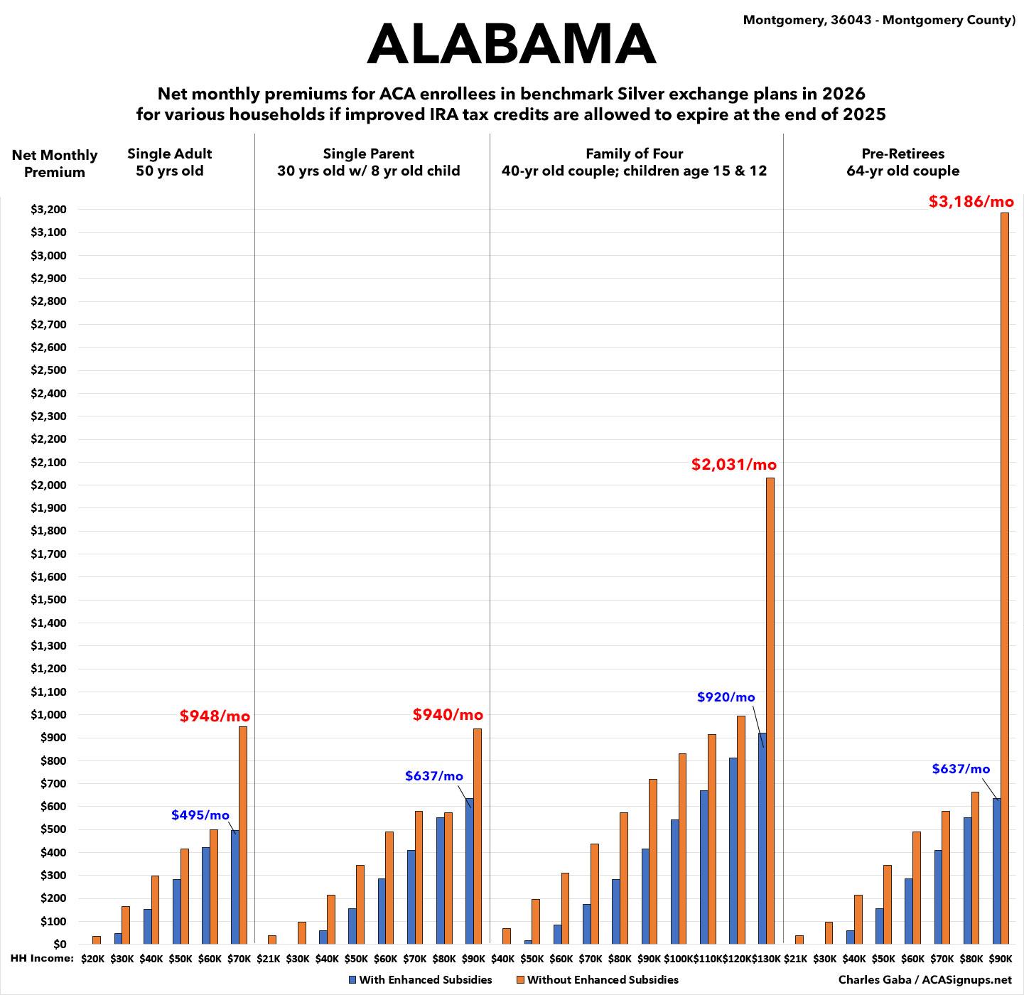 • Benchmark Silver premiums vary widely depending on where you live & other factors. For Alabama I'm using Montgomery.