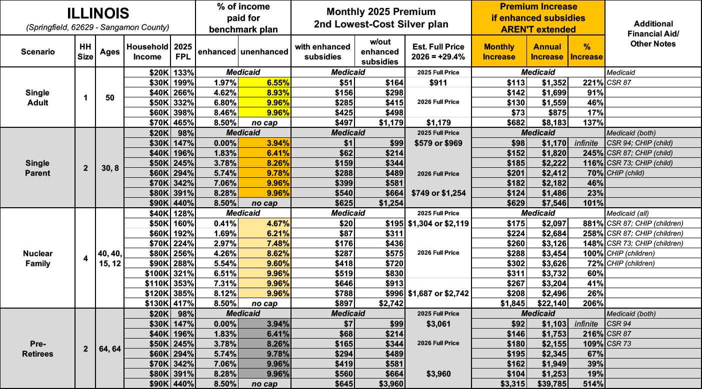 Illinois has around ~466,000 residents enrolled in ACA exchange plans, 90% of whom are currently subsidized. I estimate they also have another ~57,000 unsubsidized off-exchange enrollees.