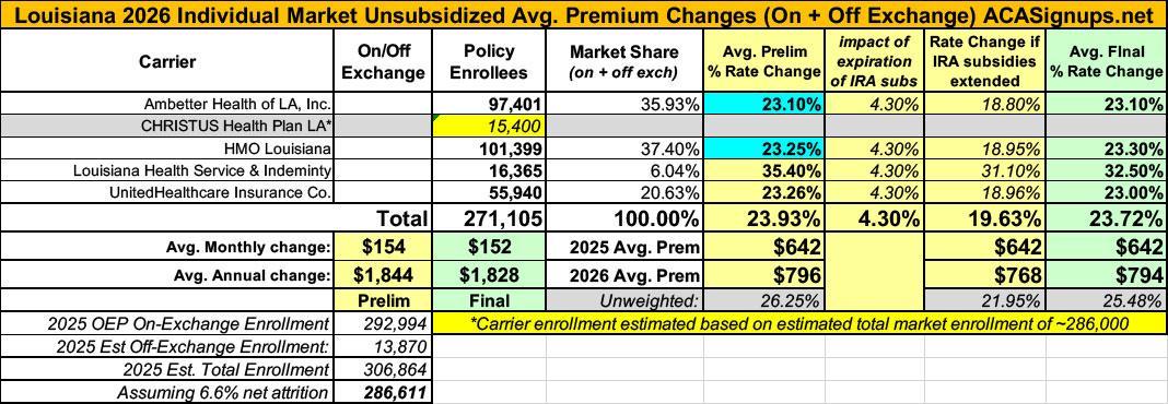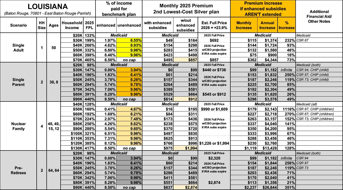 Louisiana has around ~293,000 residents enrolled in ACA exchange plans, 96% of whom are currently subsidized. I estimate they also have another ~13,000 unsubsidized off-exchange enrollees.