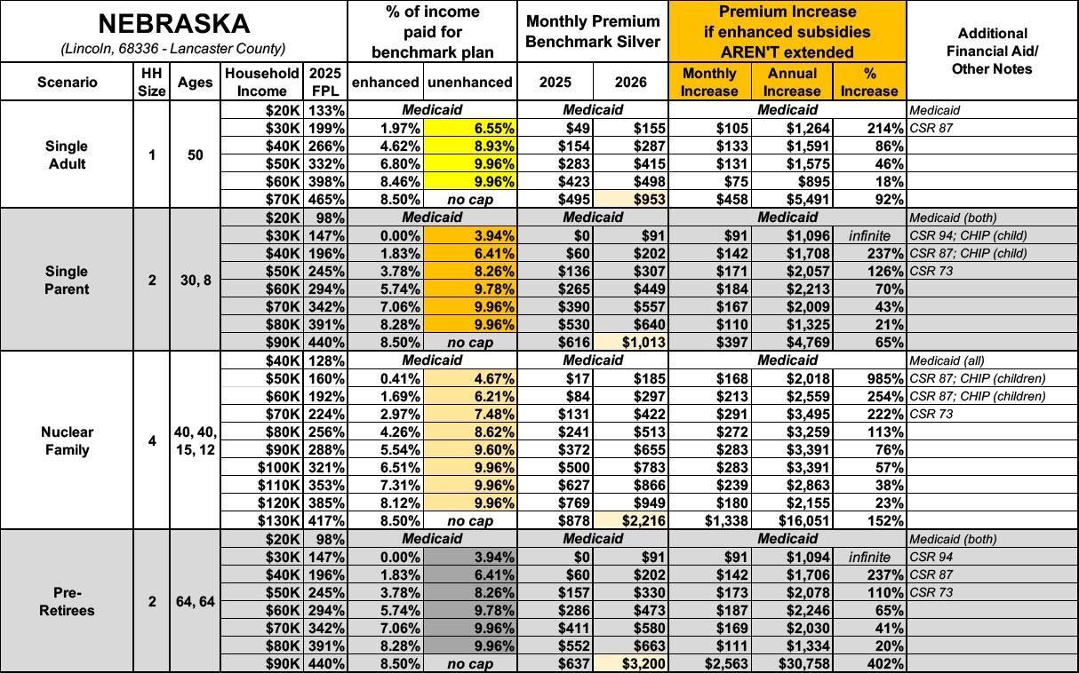 Nebraska has around ~136,000 residents enrolled in ACA exchange plans, 95% of whom are currently subsidized. I estimate they also have another ~2,000 unsubsidized off-exchange enrollees.
