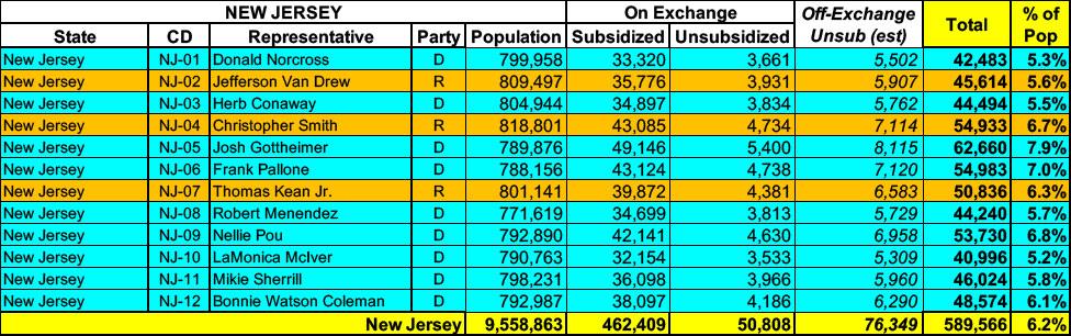 New Jersey has around ~513,000 residents enrolled in ACA exchange plans, 85% of whom are currently subsidized. I estimate they also have another ~76,000 unsubsidized off-exchange enrollees.
