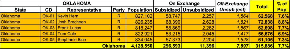 Oklahoma has around ~293,000 residents enrolled in ACA exchange plans, 93% of whom are currently subsidized. I estimate they also have another ~7,000 unsubsidized off-exchange enrollees.