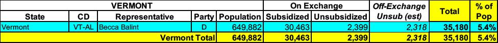 Vermont has around ~32,000 residents enrolled in ACA exchange plans, 93% of whom are currently subsidized. I estimate they also have another ~2,000 unsubsidized off-exchange enrollees.