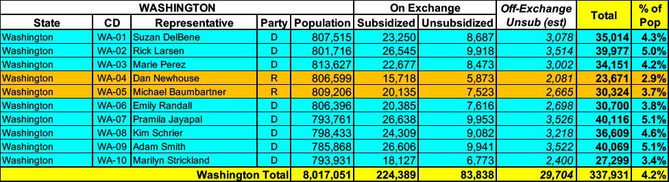 Washington State has around ~308,000 residents enrolled in ACA exchange plans, 73% of whom are currently subsidized. I estimate they also have another ~29,000 unsubsidized off-exchange enrollees.