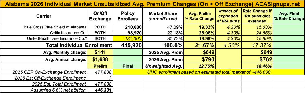 UPDATE 10/18/25: Alabama's individual market carriers have published their approved 2026 gross rate filings. The only major change was Celtic, which had their increase reduced from 29% to 25%. Overall the weighted average increase was shaved down slightly to 21.1%.