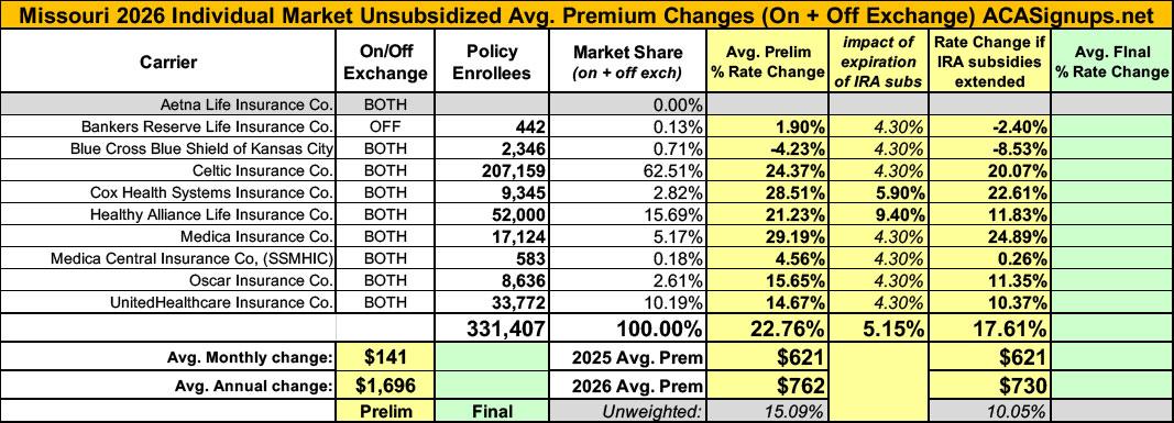 2026 Rate Changes - Missouri: +22.8%; ~417,000 enrollees looking at massive rate hikes in January
