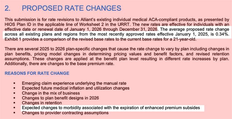 Alliant Health Plans: Alliant is requesting a nominal 0.3% increase next year if CSR payments aren't reinstated and a 1.0% drop if they are. In both cases, premiums would be 2.8% lower if IRA subsidies were to be extended by Congress: