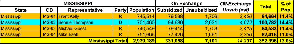 Mississippi has around ~338,000 residents enrolled in ACA exchange plans, 98% of whom are currently subsidized. I estimate they also have another ~14,000 unsubsidized off-exchange enrollees.