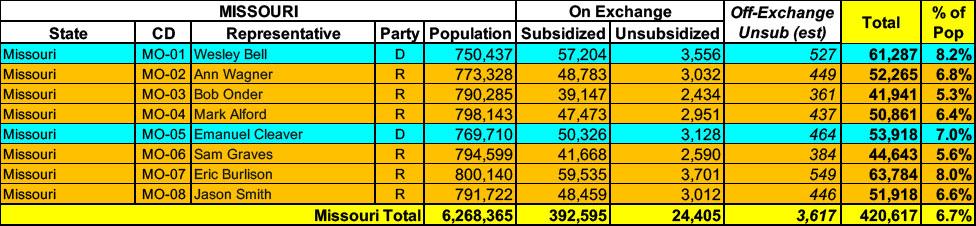 Missouri has around ~417,000 residents enrolled in ACA exchange plans, 94% of whom are currently subsidized. I estimate they also have another ~3,600 unsubsidized off-exchange enrollees.