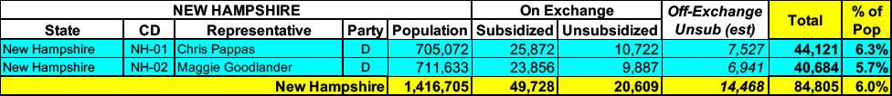 New Hampshire has around ~70,000 residents enrolled in ACA exchange plans, 71% of whom are currently subsidized. I estimate they also have another ~14,000 unsubsidized off-exchange enrollees.